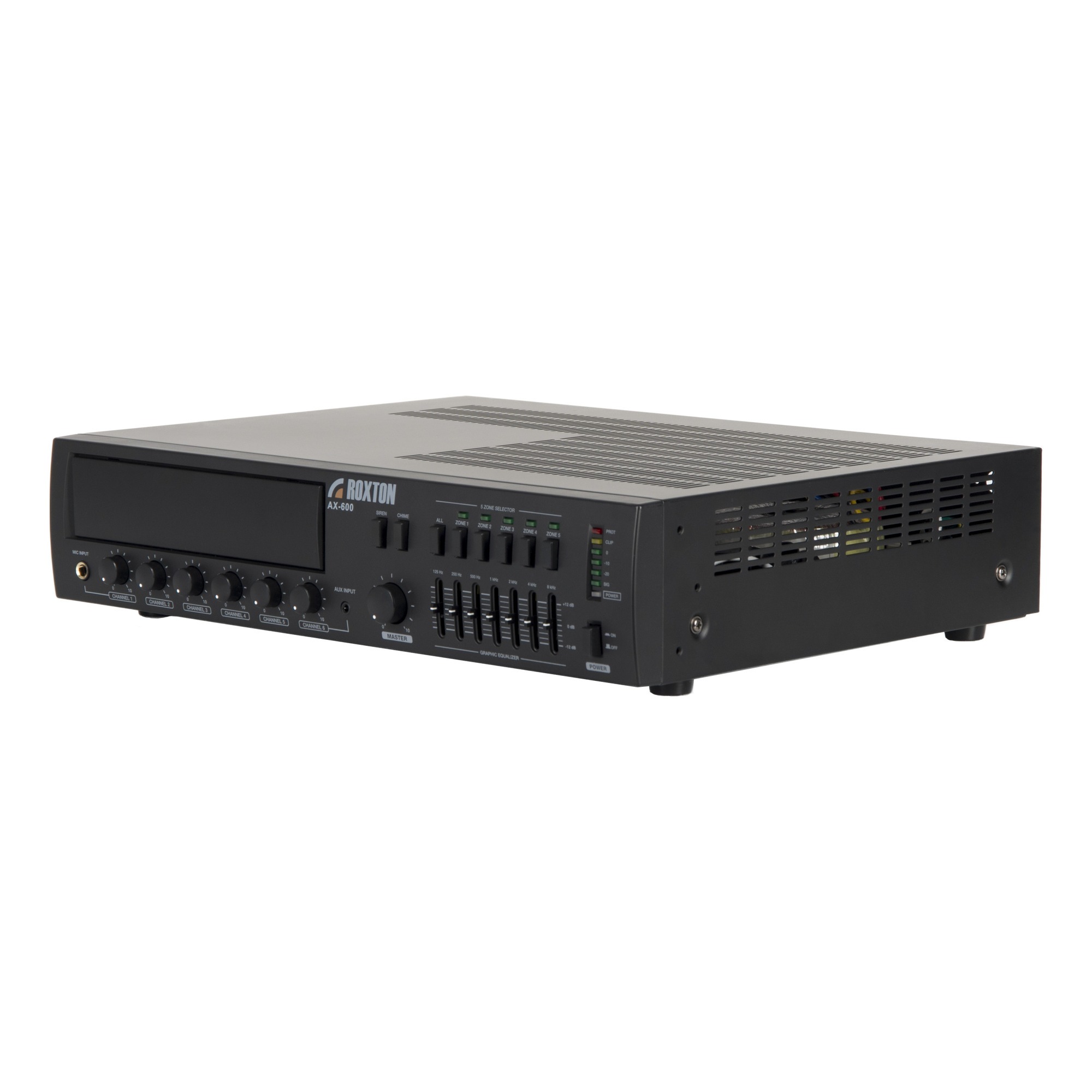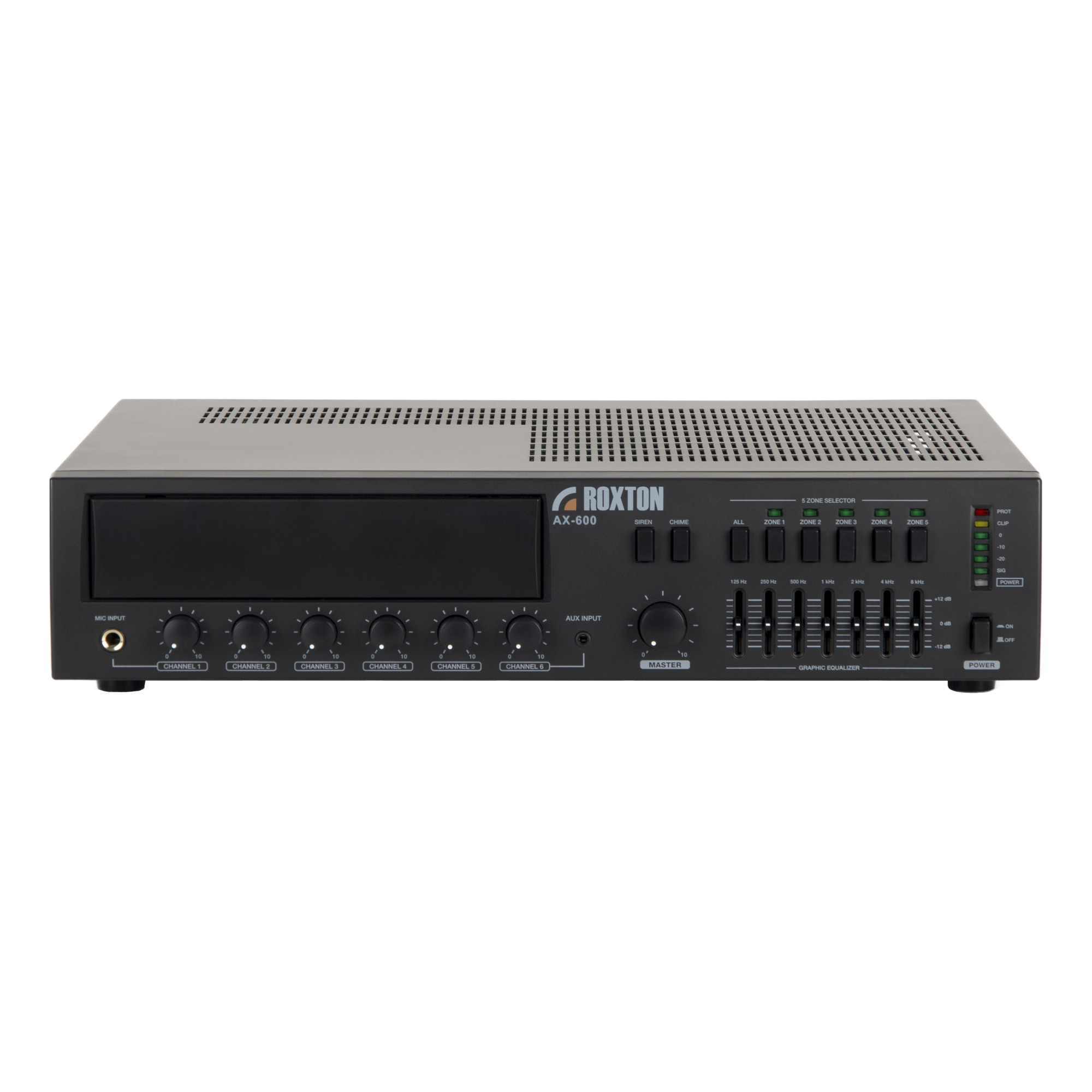 Встроенный селектор зон, коммутирующий высоковольтные выходы усилителя с пятью линиями громкоговорителей даёт возможность выбора, в какие зоны транслировать аудиосигнал. Помимо этого, Roxton AX-600 оборудован 7-ми полосным графический эквалайзером выходного аудиосигнала позволяющего получать требуемую выразительность и громкость звучания транслируемой музыки и речи. Применение усилителя класса D и импульсный блок питания позволили добиться снижения веса усилителя и уменьшения потребляемой энергии без потери качества транслируемого звука. Сочетание огромного количества функций, простоты использования и надёжности сделали Roxton AX-600 незаменимым при озвучивании кафе, баров, ресторанов, административных и офисных помещений.