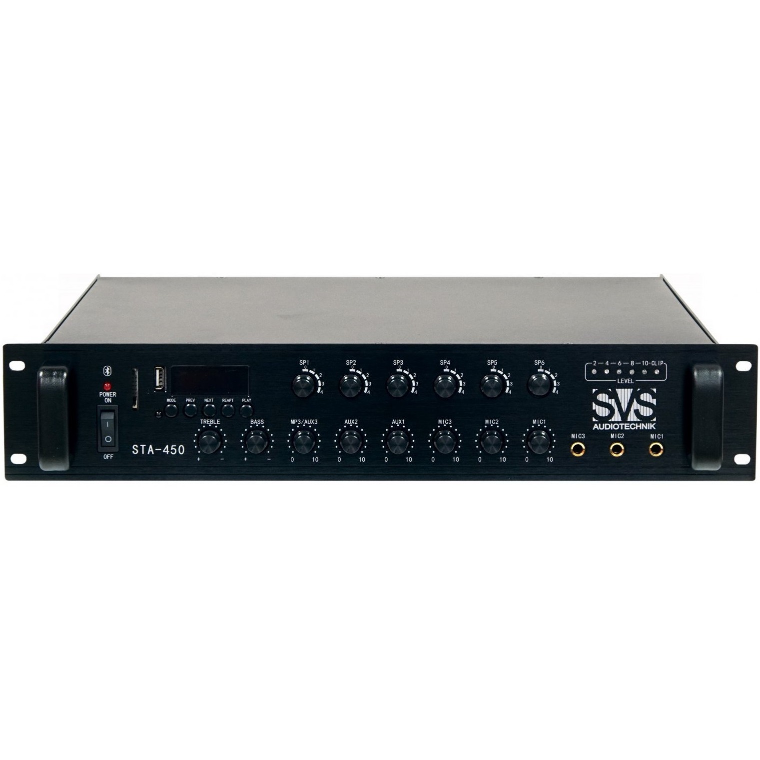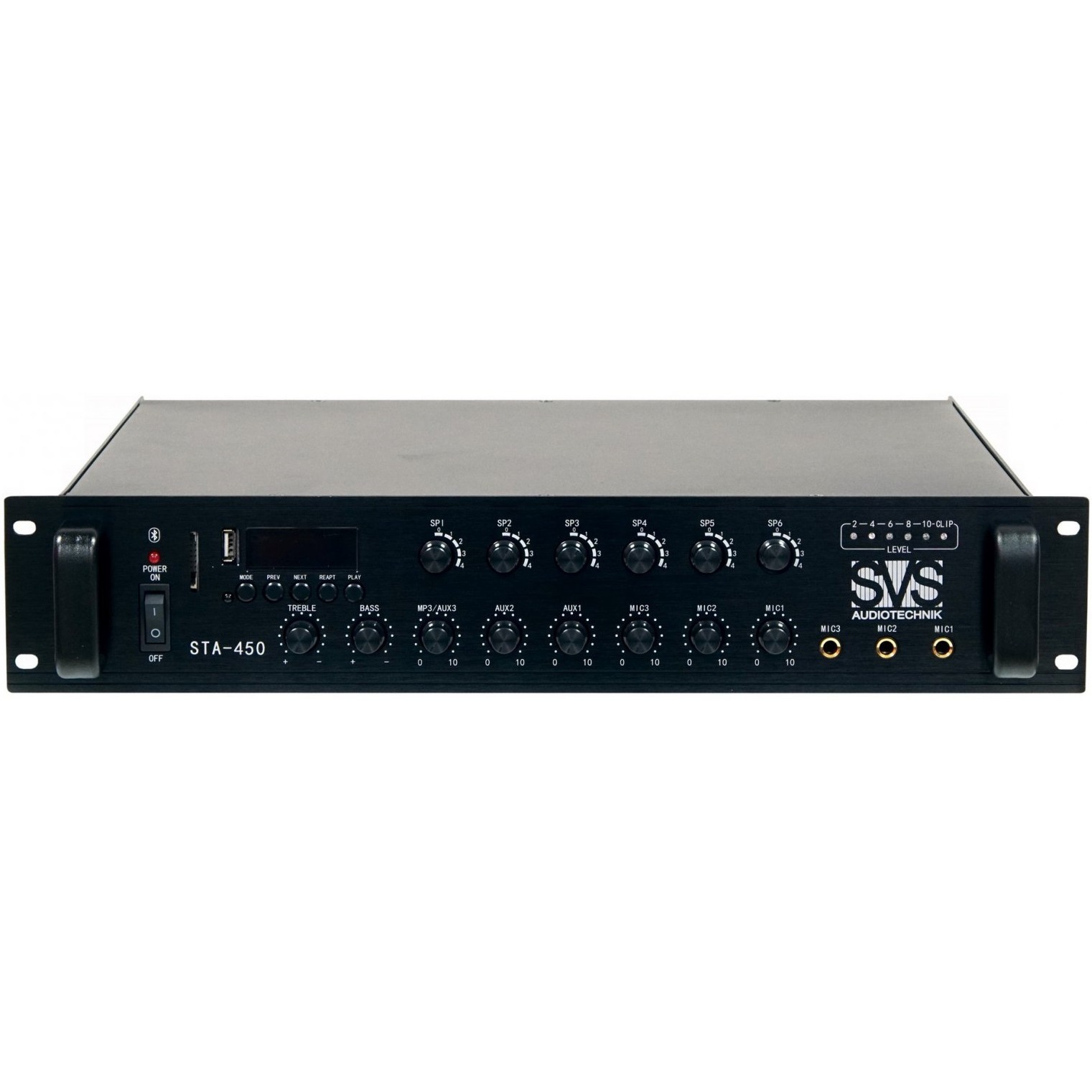 SVS Audiotechnik STA-450 – это микшер усилитель с шестью спикерными зонами с регулировкой громкости и встроенный модуль источника сигнала: MP3 USB/SDcard, FM-тюнер, Bluetooth.