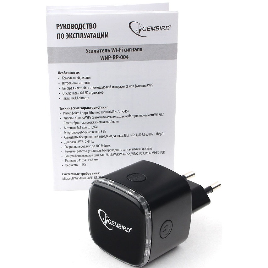 Wi-Fi адаптер Gembird WNP-RP-004 - репитер (усилитель) сигнала беспроводной сети в черном корпусе, который получает питание напрямую от розетки электросети. Прибор является практичным решением для дома или квартиры большой площади, обеспечивая сплошную зону покрытия Wi-Fi и ликвидируя "мертвые зоны" с недостаточной мощностью сигнала. Передатчик усилителя работает на частоте 2.4 ГГц, обеспечивая скорость беспроводного соединения до 300 МБит в сек.