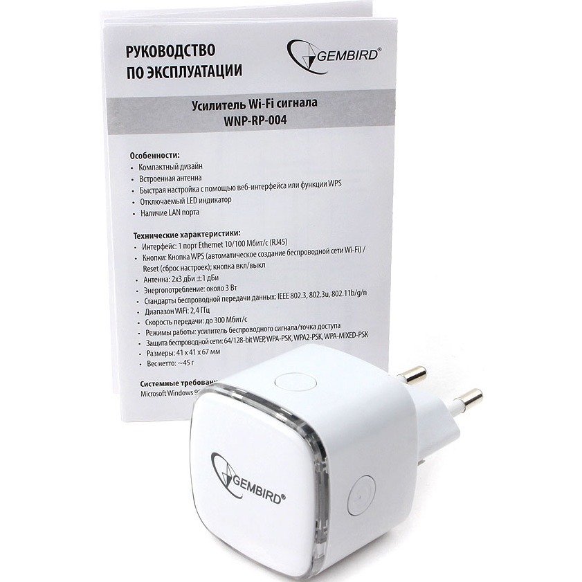 Wi-Fi адаптер Gembird WNP-RP-004 - репитер (усилитель) сигнала беспроводной сети в пластиковом корпусе, который получает питание напрямую от розетки электросети. Прибор является практичным решением для дома или квартиры большой площади, обеспечивая сплошную зону покрытия Wi-Fi и ликвидируя "мертвые зоны" с недостаточной мощностью сигнала. Передатчик усилителя работает на частоте 2.4 ГГц, обеспечивая скорость беспроводного соединения до 300 МБит в сек.