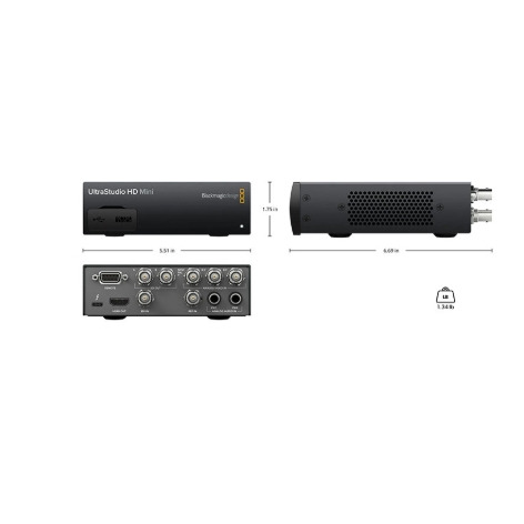 Модель UltraStudio HD Mini оснащается интерфейсами профессионального уровня, включая 3G-SDI, аналоговый (YUV) и композитный (NTSC/PAL) входы, а также синхровход. Для использования аналоговых источников с балансным звуком и аппаратуры класса Hi-Fi есть два разъема 1/4 дюйма. Кроме того, предусмотрен порт RS-422, который позволяет управлять вещательными деками в удаленном режиме. Выводить сигнал можно через двухканальный выход 3G-SDI для кеинга или через HDMI для мониторинга на большом экране.