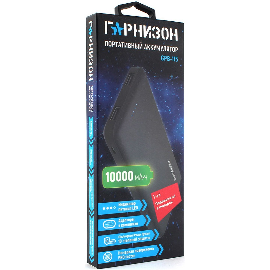 Внешний аккумулятор Гарнизон GPB-115 продлит автономную работу ваших цифровых устройств. Power Bank оснащен литий-полимерной батареей емкостью 10000 мАч и двумя USB-портами с максимальным зарядным током 2.1А. Устройство имеет 10 степеней защиты, помогающих обезопасить подключаемую электронику от поломок. Для контроля уровня заряда предусмотрен встроенный LED индикатор. Благодаря компактной конструкции и небольшому весу зарядное устройство будет удобным для использования в поездках. В комплект поставки входят USB-кабель для зарядки, адаптеры Type-C и Lightning. Также в коробке вы найдете промокод от онлайн-кинотеатра IVI.