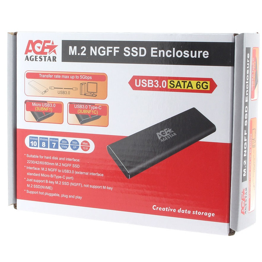 AgeStar 3UBNF1 - внешний карман для установки M. 2 NGFF SSD. Предназначен для накопителей форм-фактора M. 2, поддерживает интерфейс скоростного типа для максимально быстрой передачи данных. Имеет прочную конструкцию, поэтому убережет диск от повреждений. Позволит использовать диск для резервного копирования и упрощенного переноса большого массива данных. Данная модель превосходно подойдет для безопасной транспортировки и подключения жесткого диска к ПК. Компактные размеры устройства делают его незаменимым и удобным при копировании данных в деловых поездках и путешествиях. Бокс от компании AgeStar изготовлен из высококачественных материалов, которые надежно предохраняют жесткий диск от разного рода механических повреждений. Прочный, надежный и функциональный внешний бокс AgeStar станет полезным приобретением для всех пользователей компьютера.