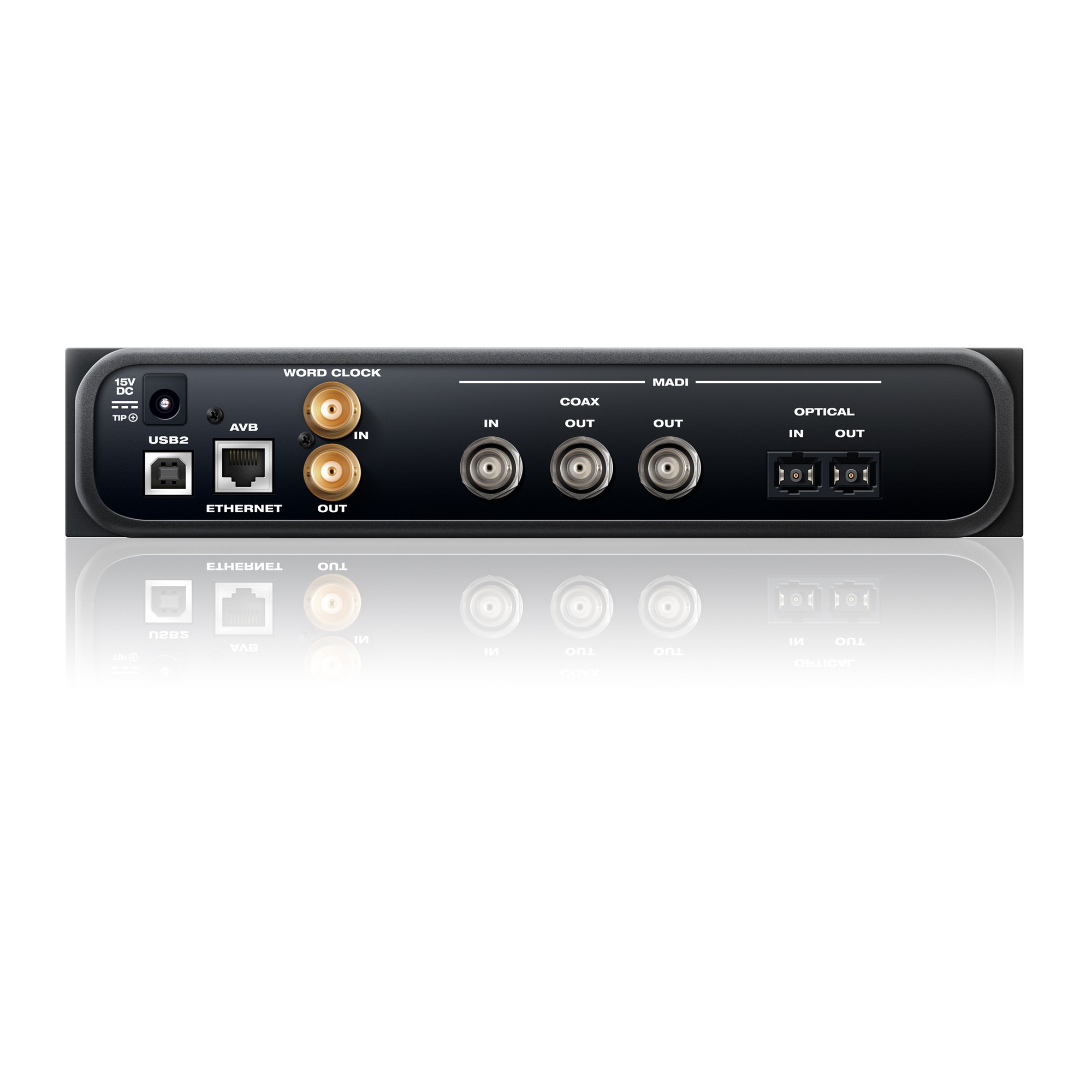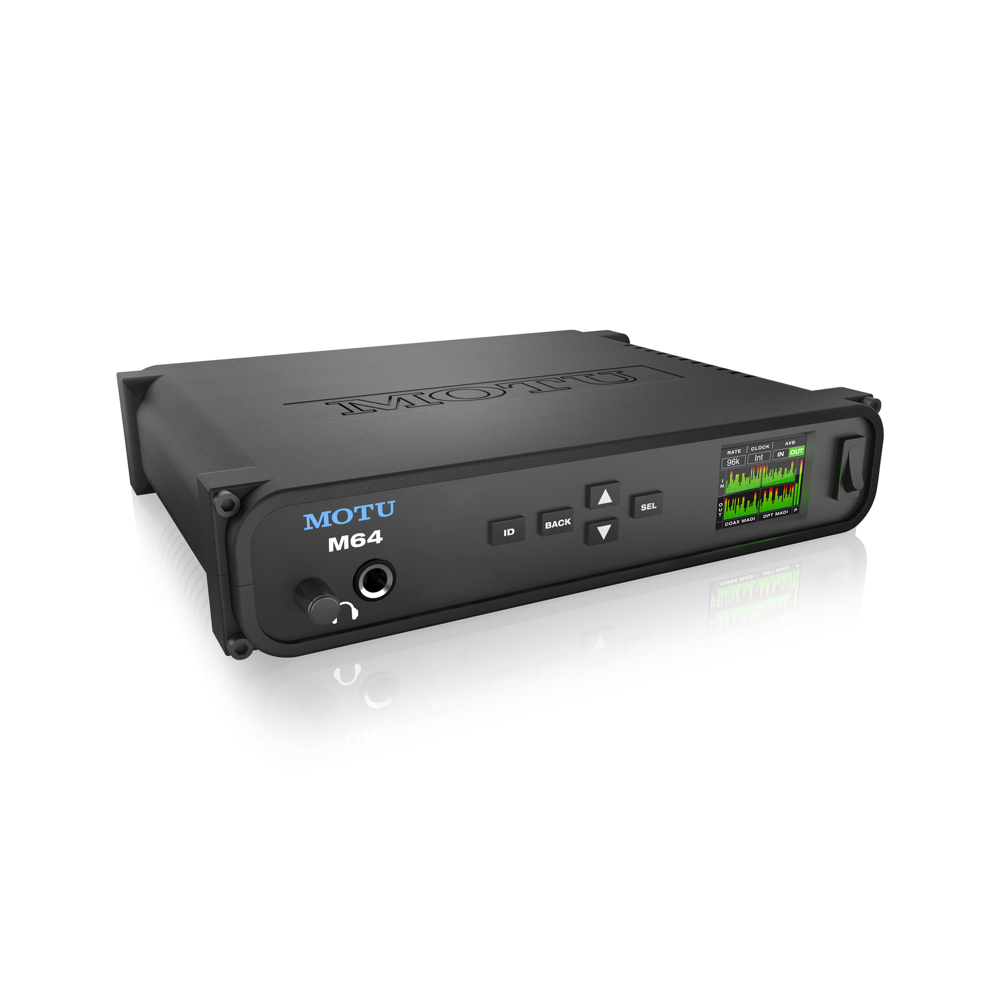 MOTU M64 звуковая карта имеет "на борту" цифровые оптический и коаксиальный интерфейсы формата MADI (до 256 каналов ввода/вывода в общей сложности), стереофонический выход на наушники, сетевой интерфейс AVB, а также вход и выход синхронизации Word Clock. MOTU M64 имеет мощный встроенный DSP-процессор, на базе которого реализованы 48-канальный микшер, различные анализаторы и эффекты.