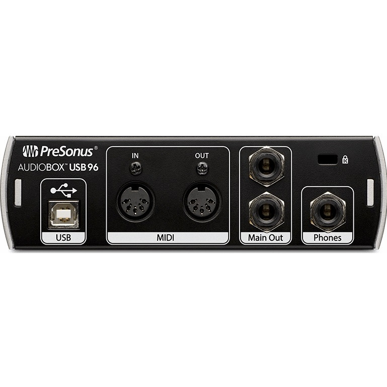 Коммутационные возможности PreSonus AudioBox USB 96 представлены 2-мя микрофонными/инструментальными комбовходами XLR-1/4", 2-мя балансными линейными main-выходами на разъёмах TRS, одним стереофоническим выходом на наушники (заявлена мощность 2 × 60 мВт на 60-омной нагрузке), а также входом и выходом MIDI. Наличие последних обеспечивает возможность подключения к новинке синтезатора или MIDI-контроллера. Питание интерфейс получает по шине USB, подключение внешнего адаптера тут не предусмотрено.