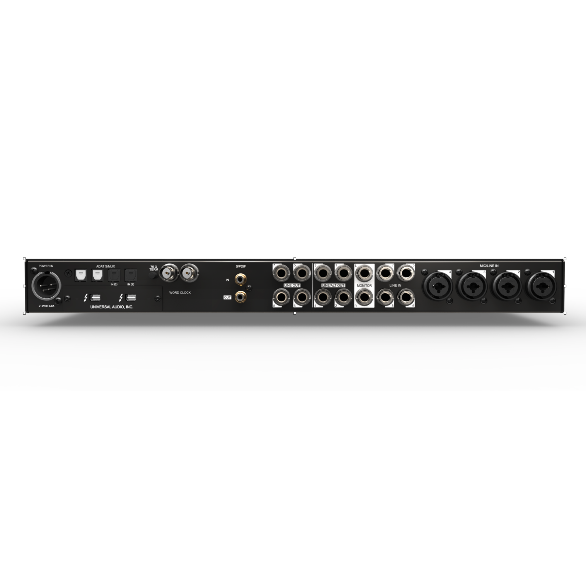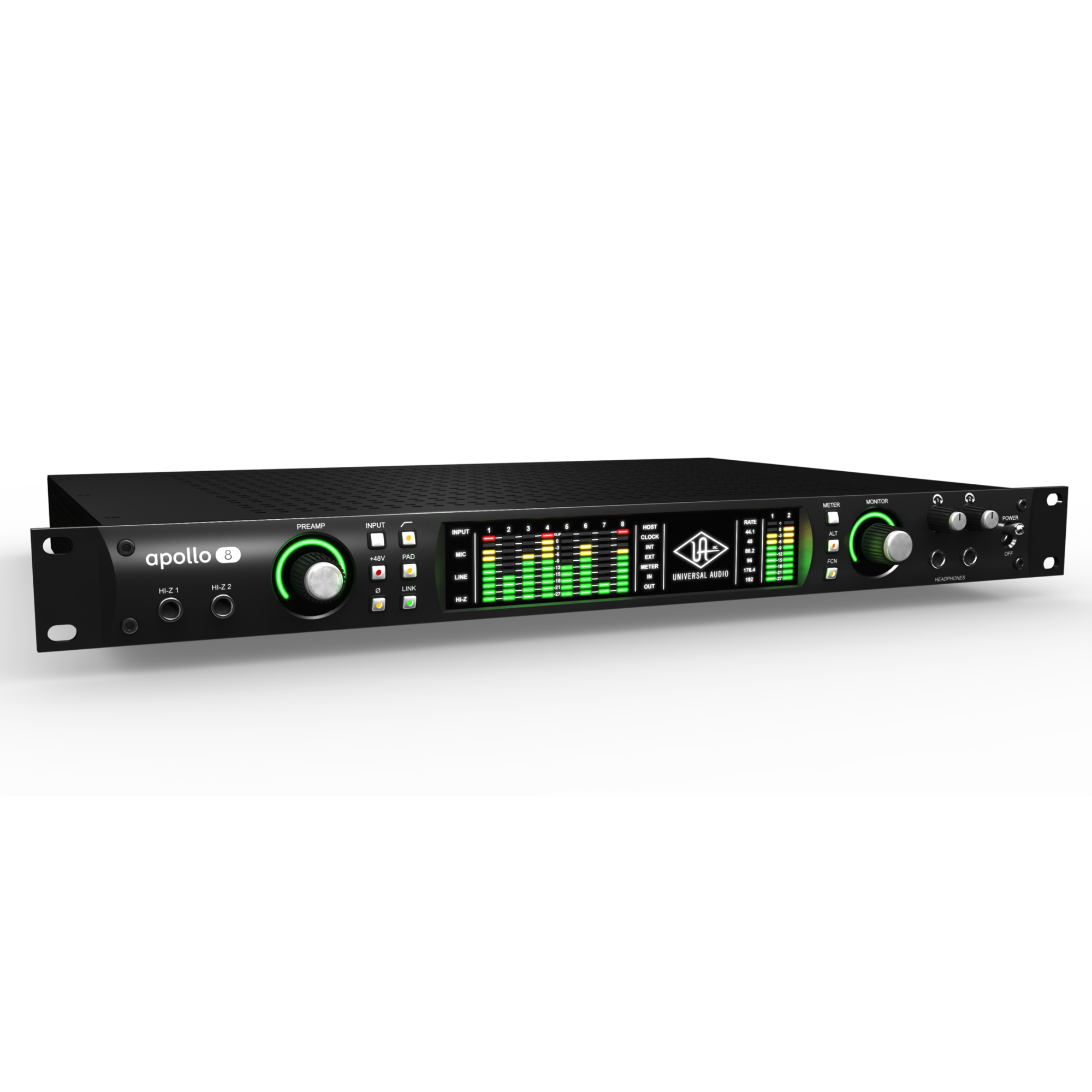 Universal Audio Apollo 8 Duo - однорэковый аудиоинтерфейс для шины Thunderbolt 2, 18 входов и 24 выхода одновременно (восемь аналоговых входов, в том числе два инструментальных и четыре микрофонных, десять линейных выходов и два стереовыхода для наушников, восьмиканальный оптический цифровой интерфейс формата ADAT и двухканальный электрический интерфейс формата SPDIF), два встроенных DSP для плагинов формата UAD2, функции управления мониторингом. Поддержка частот дискретизации до 192 кГц, разрядности 24 бита. Прилагается набор плагинов Realtime Analog Classics Plus.