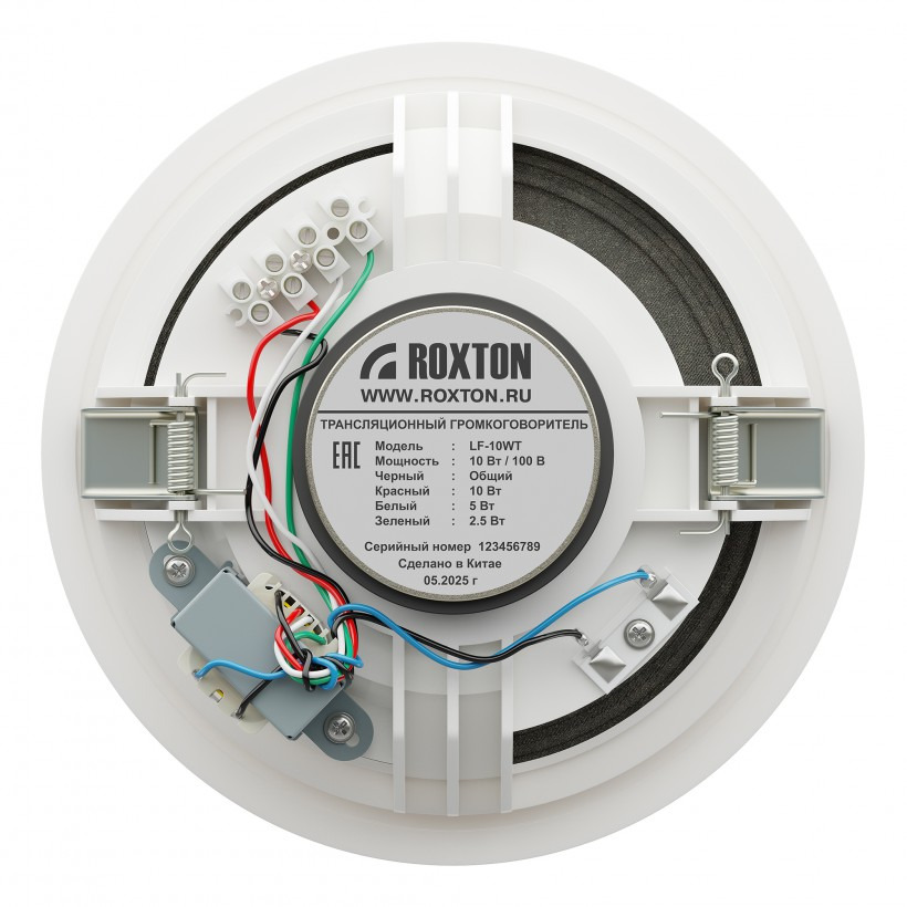Потолочный громкоговоритель ROXTON LF-10WT мощностью 10 Вт сочетает в себе хорошие акустические характеристики и удобство монтажа, что делает его незаменимым при построении систем речевого оповещения и музыкальной трансляции в офисных, торговых и других помещениях общественного назначения. Имея врезное исполнение ROXTON LF-10WT характеризуется способом излучения, при котором излучаемая звуковая энергия направлена перпендикулярно полу, что позволяет обеспечивать равномерное звуковое покрытие при монтаже в потолок. Помимо этого, широкополосный динамик, охватывающий большую часть слышимого звукового диапазона, значительно повышает качество звучания громкоговорителя. Громкоговоритель оборудован специальными защёлками, плотно прижимающими его к закрепляемой поверхности и значительно облегчающими его монтаж в горизонтальные поверхности.
