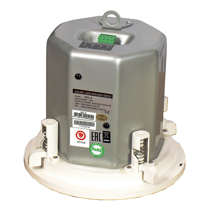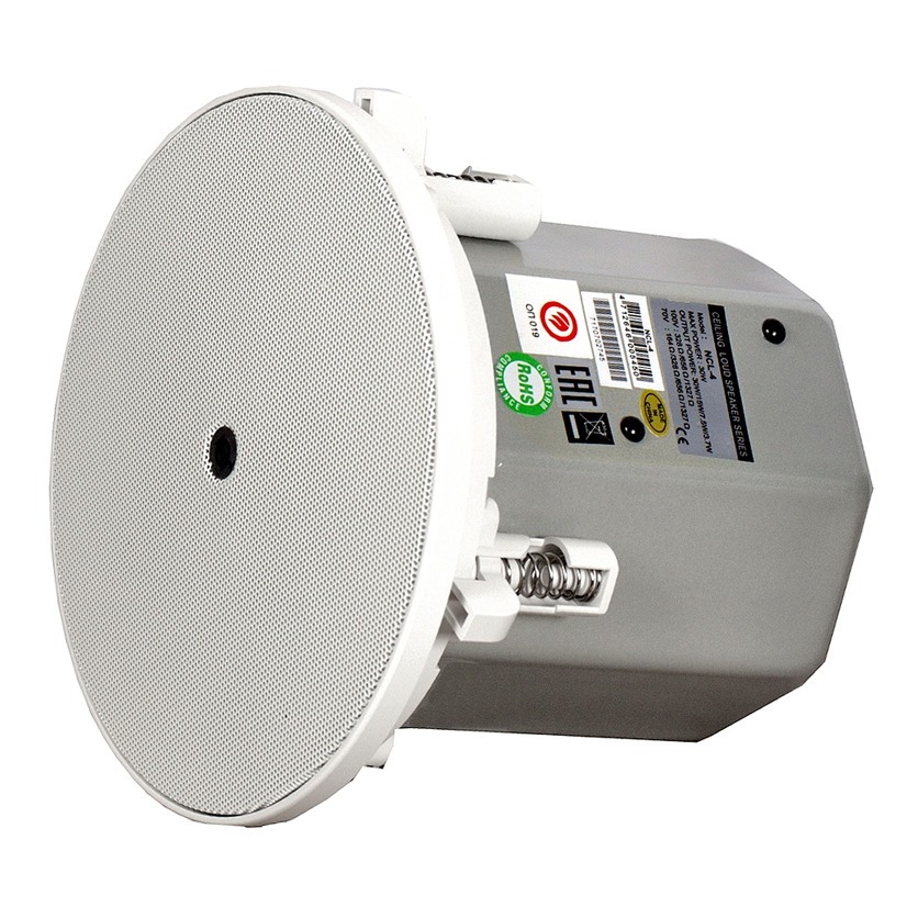 SHOW NCL-4 - 30 Вт потолочный громкоговоритель с надежной конструкцией, который идеально подходит для многочисленных инсталляций, как в общественных местах, так и в домашнем окружении. Являясь практичным и почти незаметным решением, он предоставляет мощный звук с точным воспроизведением и максимальной разборчивостью речи. 4" полипропиленовый вуфер и 3/4" твитер безупречно работают в 100 Гц – 20 кГц частотном диапазоне и прекрасно справляются с 86 дБ звуковым давлением. Плюс рельсовая система креплений дает возможность быстро и легко установить громкоговоритель на потолок.