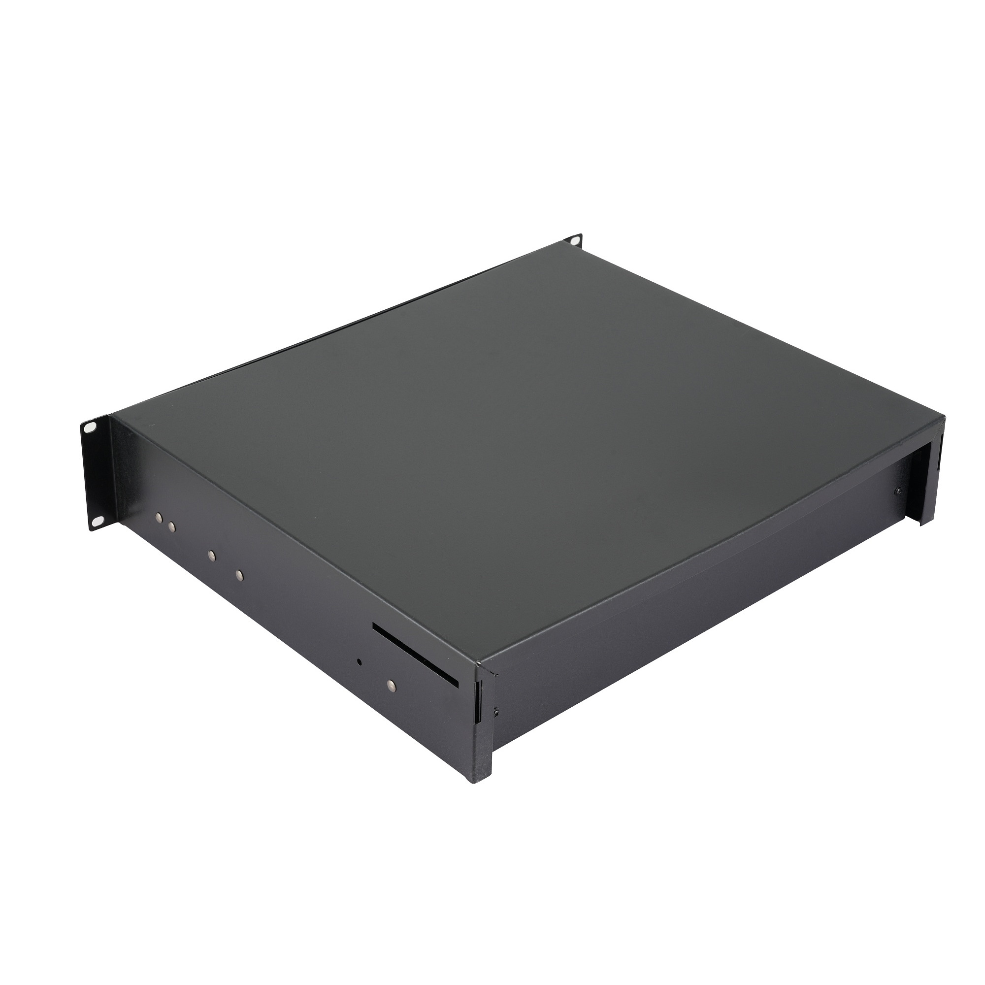 Имеет высоту 2U, оснащен выдвижным механизмом на основе шариковых направляющих.